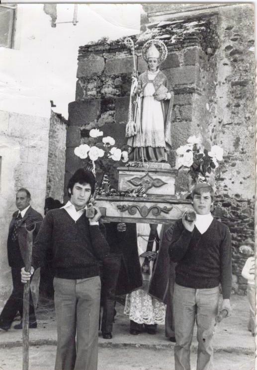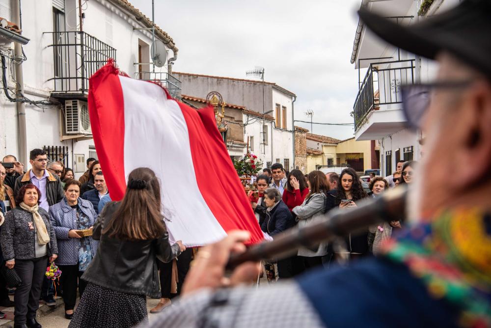 Durante la procesión, al son de flauta y tamboril extremeños, se mantiene la vieja tradición de la ECHADA DE BANDERA ante San Blas, pidiendo su protección.
